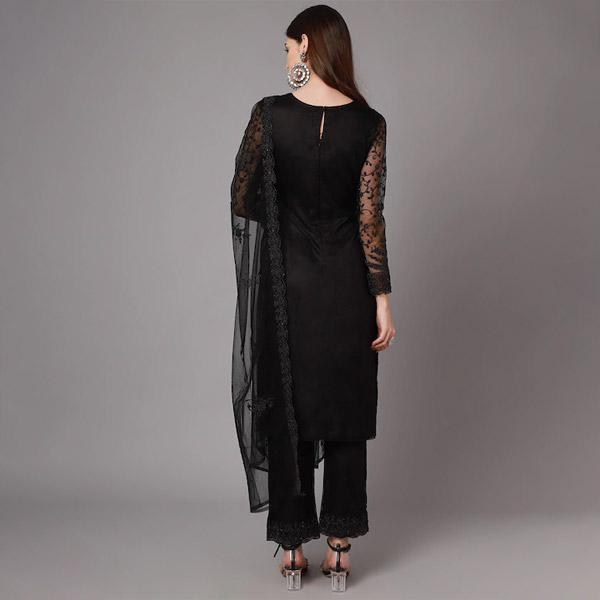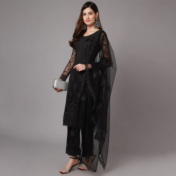 Black Embroidered Net Unstitched Dress Material